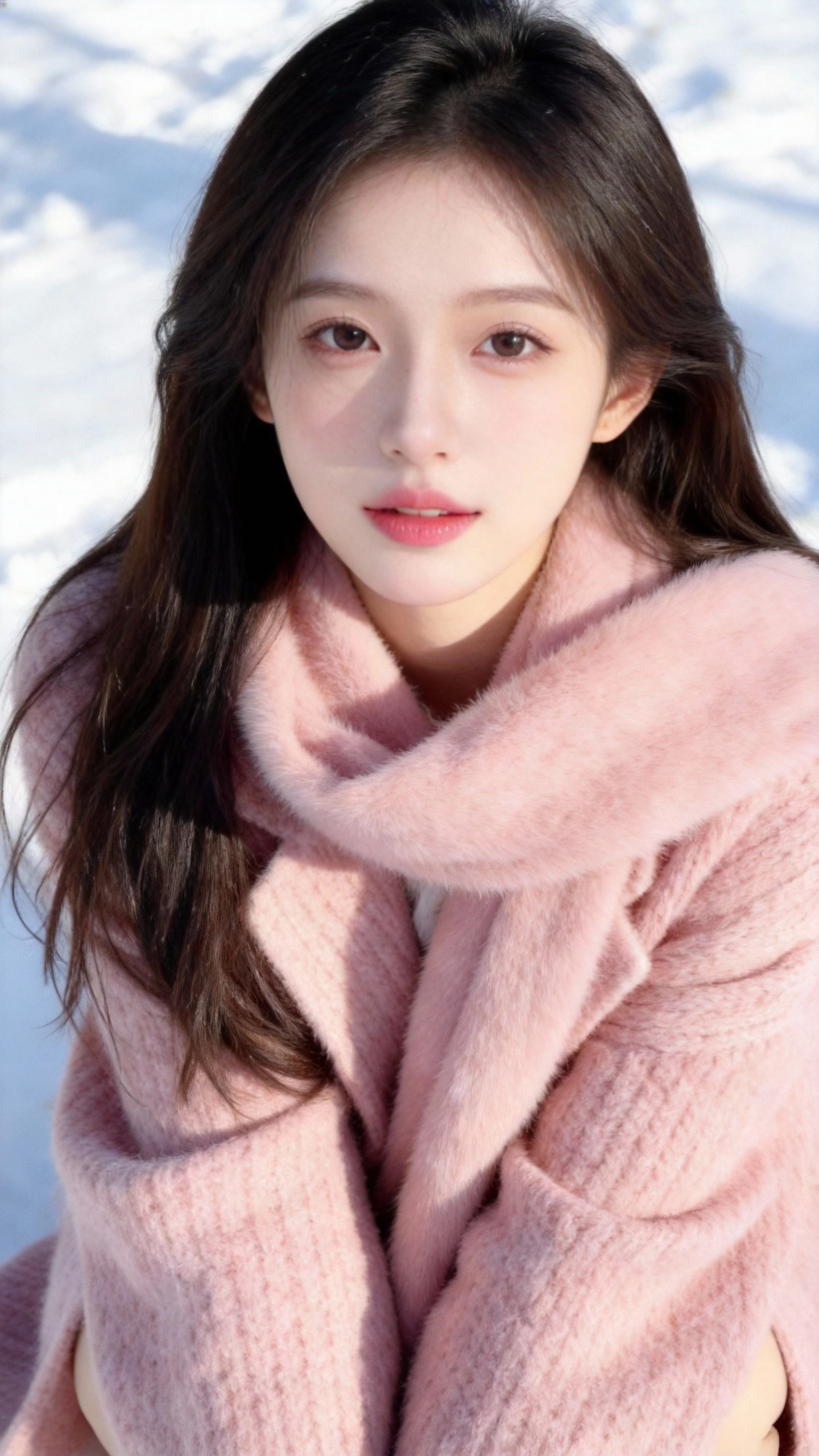 手机拍摄风格,超低分辨率,近距离,日系滤镜,笺上春秋,画面中是一位超级白、超级瘦、超级漂亮的冷白皮中国美少女,女性以俯拍视角正面呈现正脸,她蹲坐在雪地上,长发自然披散,一缕发丝拂过脸颊,身着嫩粉色的宽松粗织大衣,宽松围巾,光影在她脸上形成明暗交错的层次,凸显出柔和的面部轮廓,整体色调暖黄明亮,阳光似从侧方洒落,色彩低饱和度,甜妹感,甜妹妆色,网感妆,洋娃娃一般可爱,真人